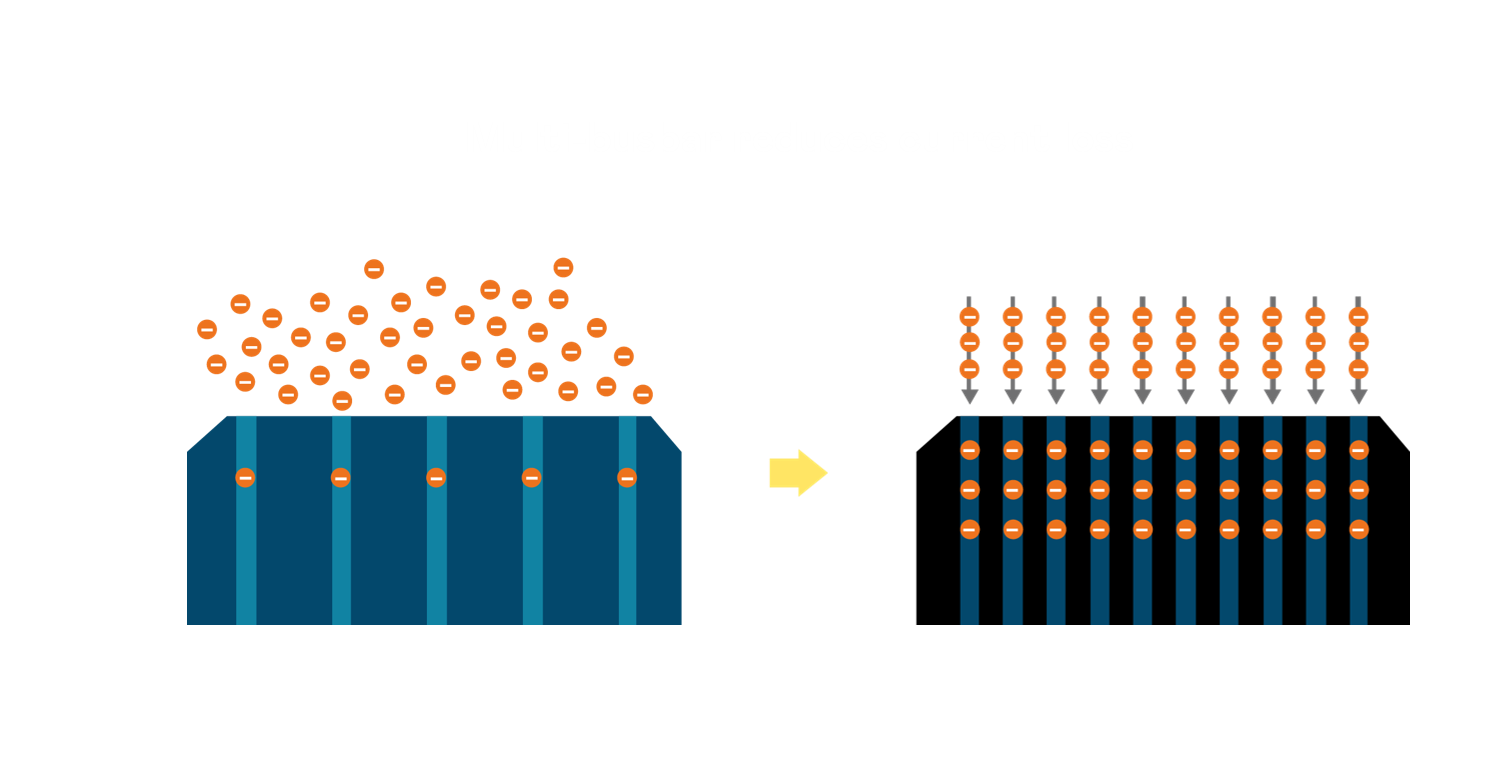• 電池使用多條銅導線 (Copper wire) 於電池片上形成較短的電流路徑,提高電流收集效率,採用圓形設計的銅導線較傳統扁平式的銅焊帶 (Ribbon),可增加入射至電池的光線量。
